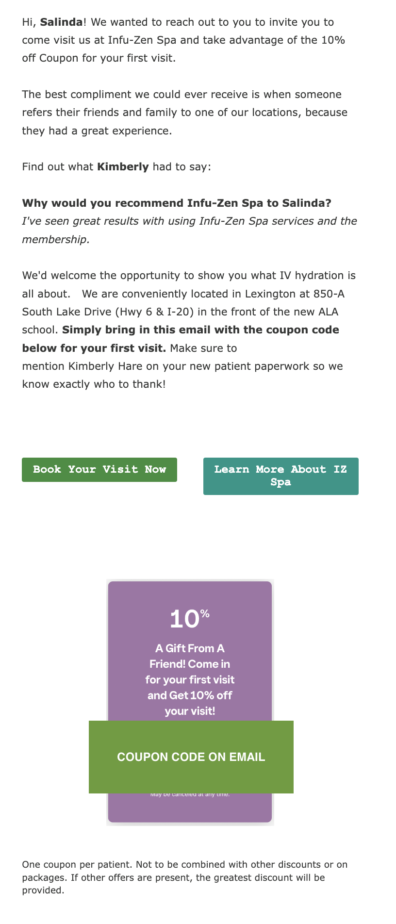 This is the exact email we will send from our system to your referral. It will provide them what you said above along with a coupon code at the bottom for 10% off of their first visit.