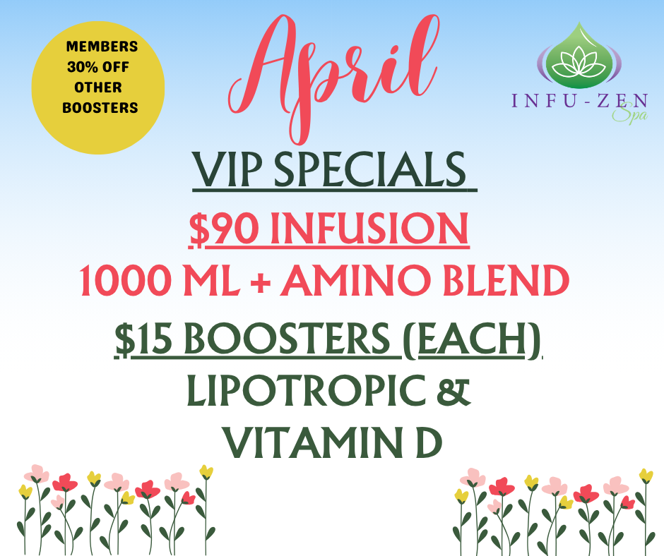Step into spring feeling refreshed, supported, and re-energized. Our April VIP Specials are designed to complement your wellness routine with hydration, amino acids, and essential nutrients.